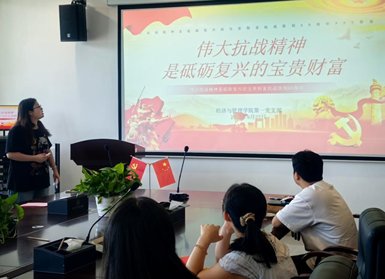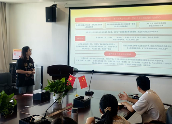 为深入学习贯彻习近平总书记关于弘扬伟大抗战精神的重要论述,激励党员教师在新时代新征程上勇担使命、奋发有为,9月23日下午,我院第一党支部在沁苑八实五楼506党员活动室开展了以“伟大抗战精神是砥砺复兴的宝贵财富”为主题的专题党课学习,本次党课由曾华同志主讲,全体党员参会。
