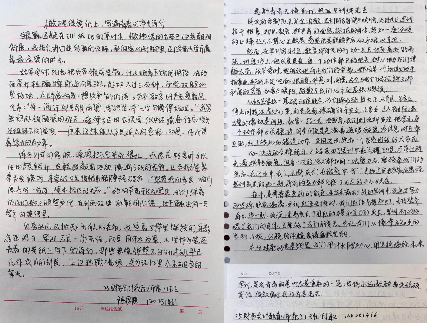 在这段难忘的军训时光里,经管学子们内心也有着诸多感触。他们用文字记录下了自己的军训瞬间,手写下的字字句句承载着他们的欢笑与汗水、坚持与成长,每一篇都诉说着独特的军训故事。