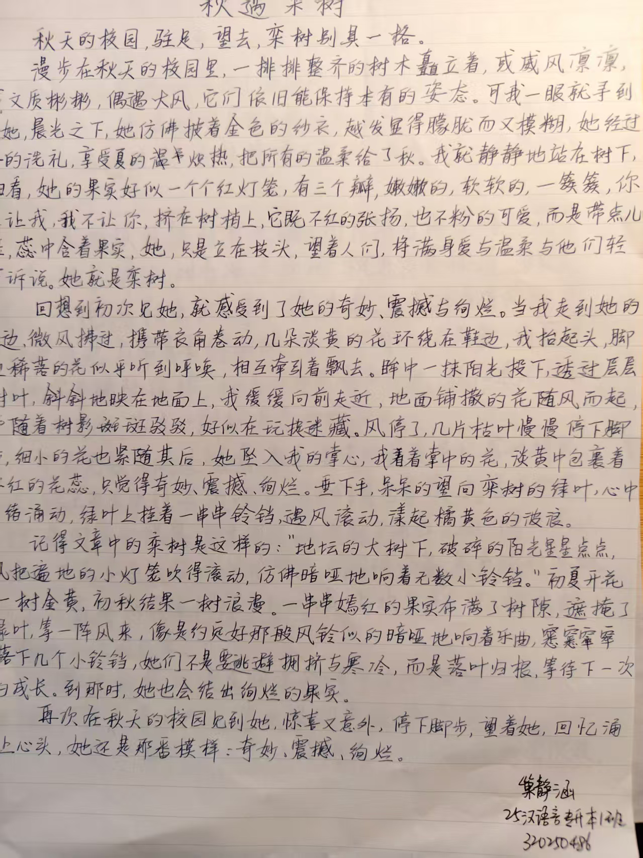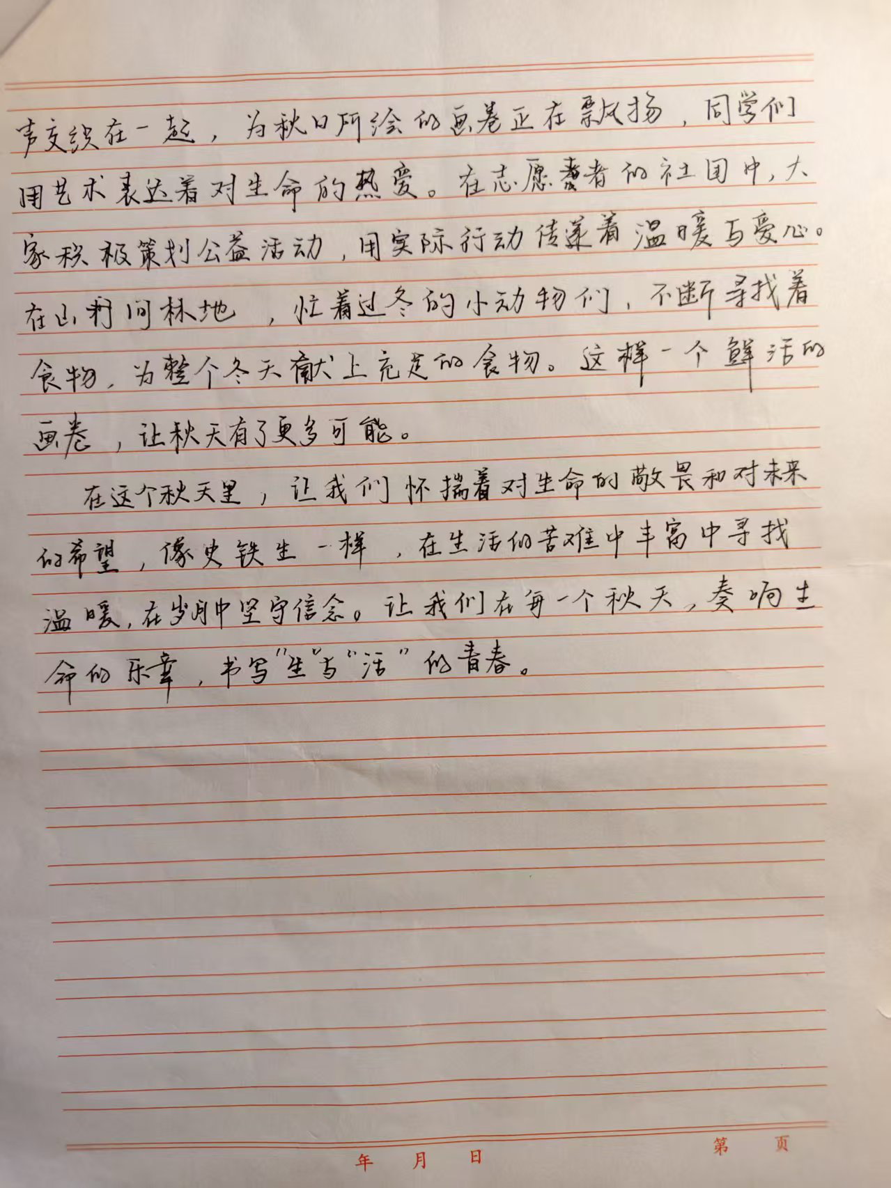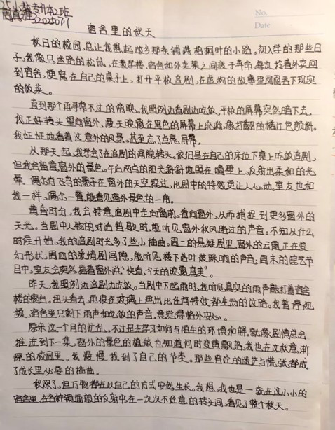 “本次“一叶知秋,落笔成诗”主题征文,以写作为核心抓手,着力推动学生将“爱读书、读好书”的阅读积累,转化为“善表达、勤动笔”的写作实践——既实现从知识输入到思想输出的关键跃升,也完成读写能力的闭环训练。活动围绕“秋”这一内涵丰富的主题,引导学子在文字中挖掘秋的文化意蕴、品味秋的生活质感,进而增强文化自信与自我认同感,实现思想淬炼与写作技能的双重突破。