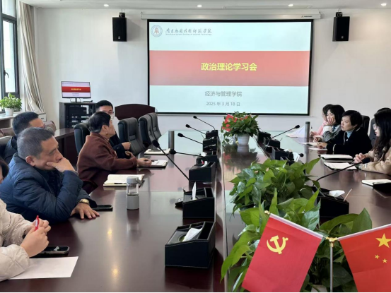 2025年3月18日,南昌应用技术师范学院经济与管理学院组织开展政治理论学习会,学院教职工齐聚会议室,深入学习近期重要政治理论内容。