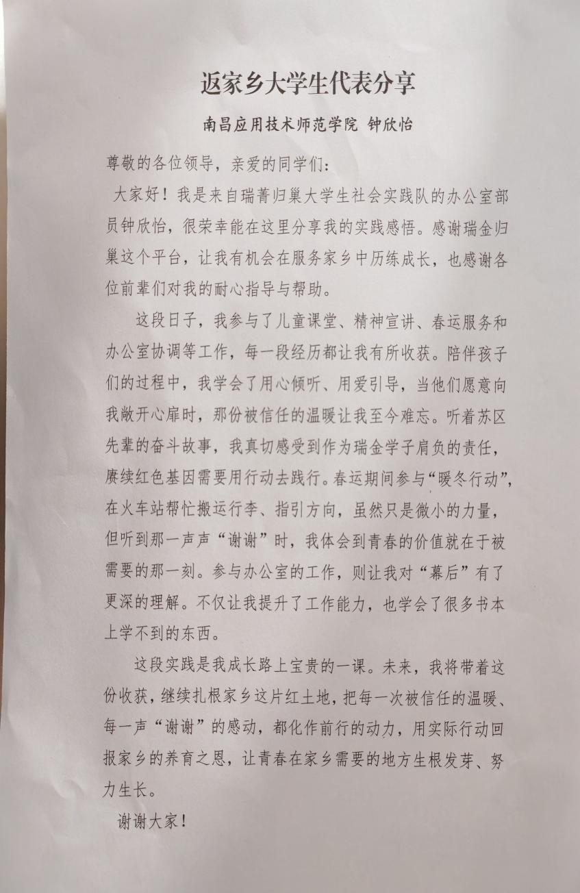 此次实践让我在多个层面获得成长。与儿童相处教会我耐心与共情,春运服务让我体会奉献的价值,社区走访使我对基层工作者的坚守心生敬意。实践中期,我参加了党的二十届四中全会精神宣讲会,宣讲将中央精神与瑞金苏区红色基因相结合,以本地青年先辈的奋斗故事诠释新时代青年的使命。聆听之余,我深感脚下这片土地的分量,作为瑞金子弟,赓续红色血脉并非抽象口号,而应体现在服务家乡的点滴行动中。