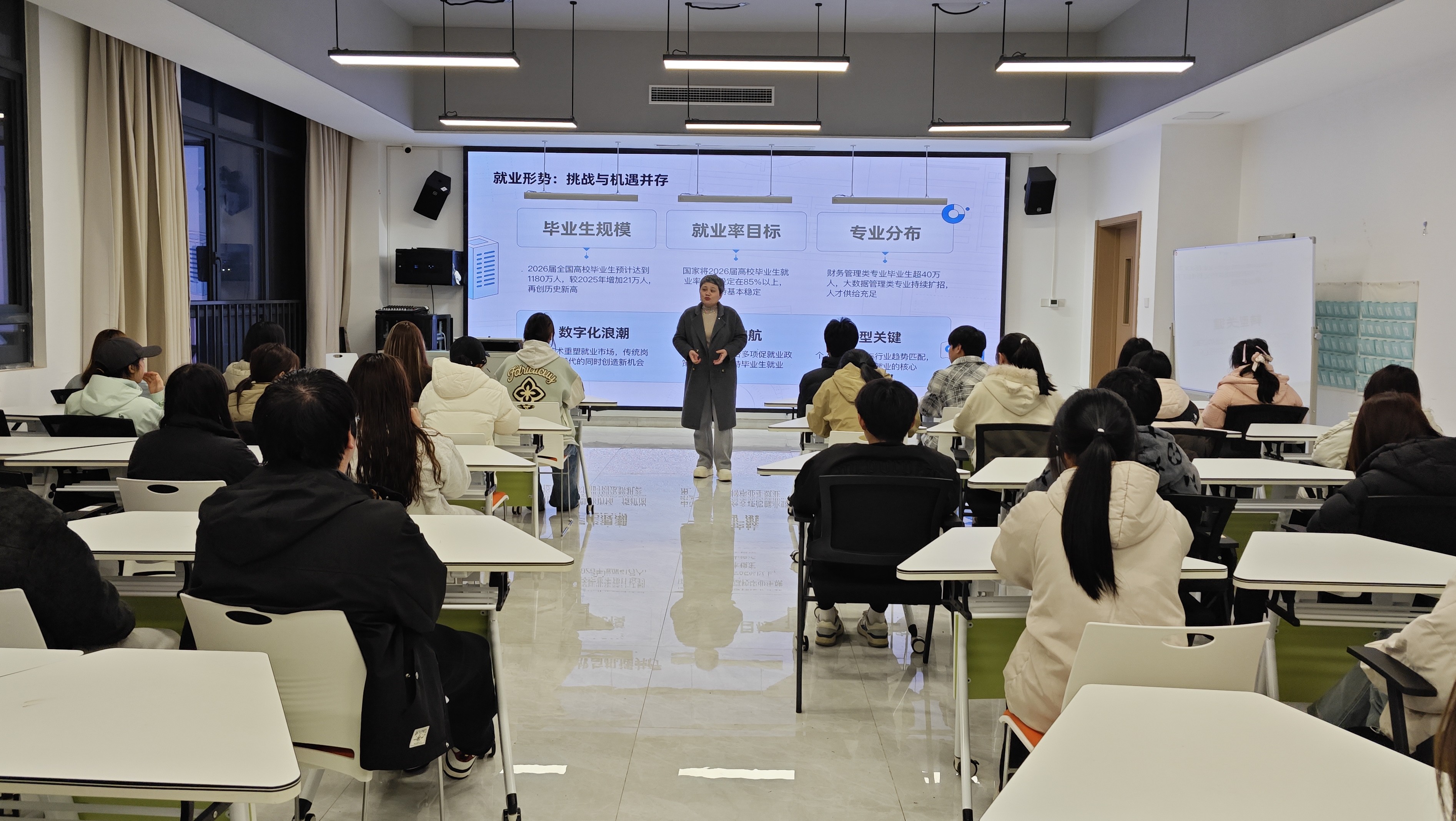 “就业第一课”内容丰富、案例详实,既有宏观的政策解读,又涉及微观的实操指导。本次院领导亲临授课,不仅体现了学院对学生就业工作的高度重视和深切关怀,更为我院后续精准化、个性化地开展就业指导服务奠定了坚实基础。全院上下也将继续围绕学生需求,整合资源、优化服务,全力促进我院2026届毕业生更加充分、更高质量就业。