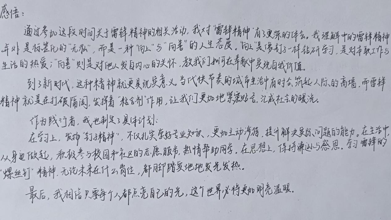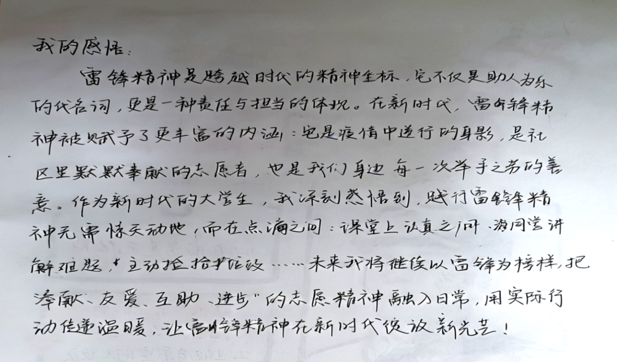 在手抄报创作的基础上,同学们更是执笔写下心中感悟,字字句句皆流露着新时代青年对雷锋精神的深刻领悟。