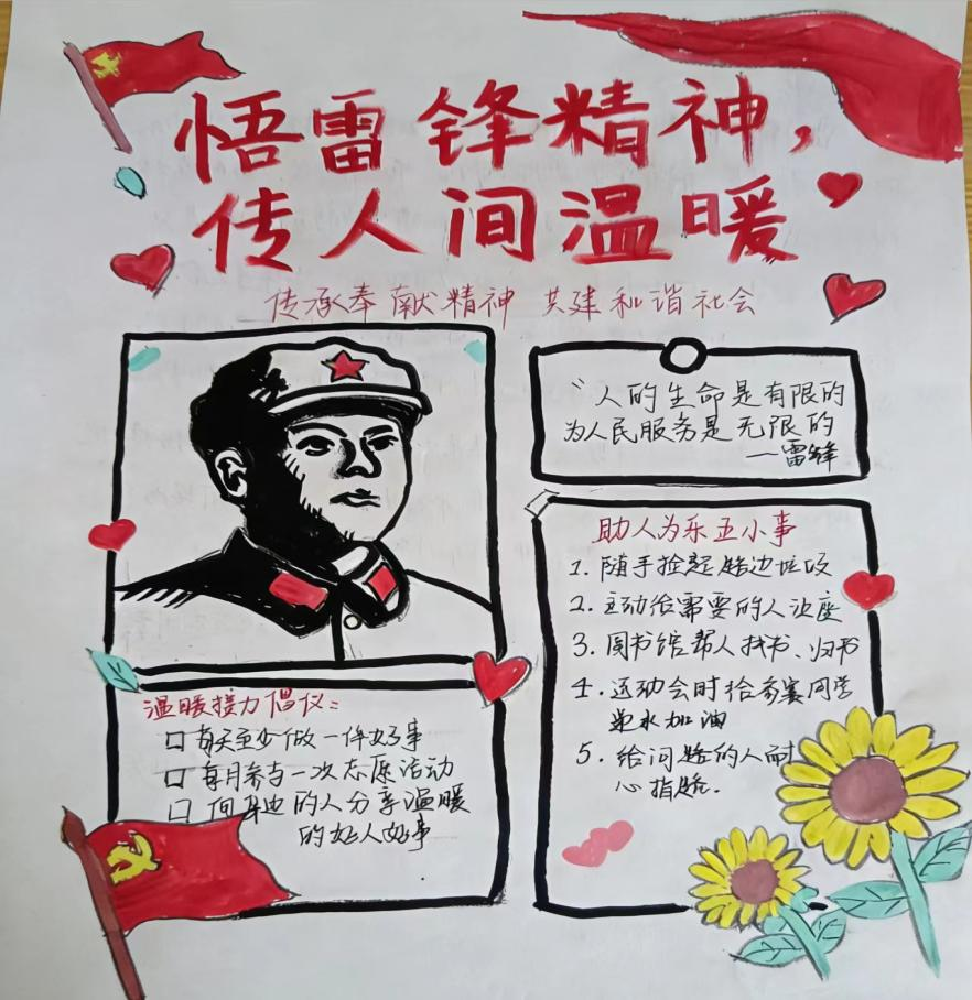 为深入学习和弘扬雷锋精神,引导学子将雷锋精神内化于心、外化于行,近日,学院精心开展“悟雷锋精神,传人间温暖”手抄报创作与感悟征集主题活动,以笔墨传情,让雷锋精神在校园中落地生根、薪火相传。
